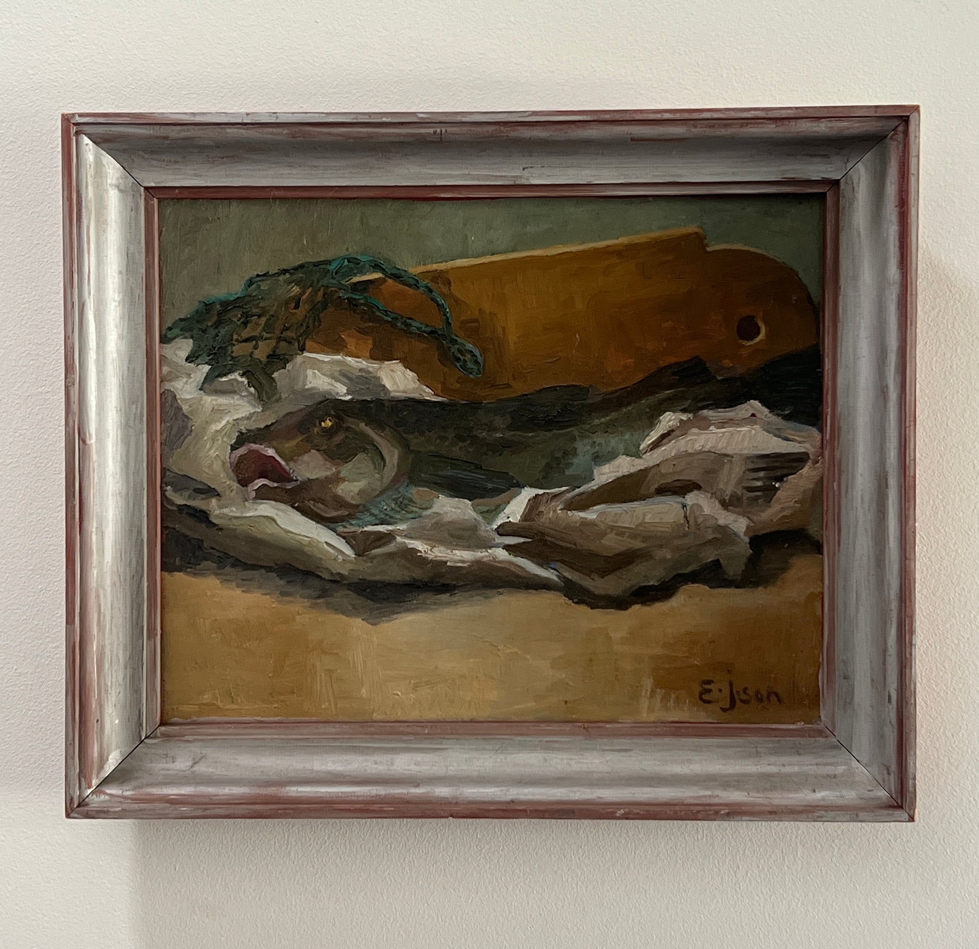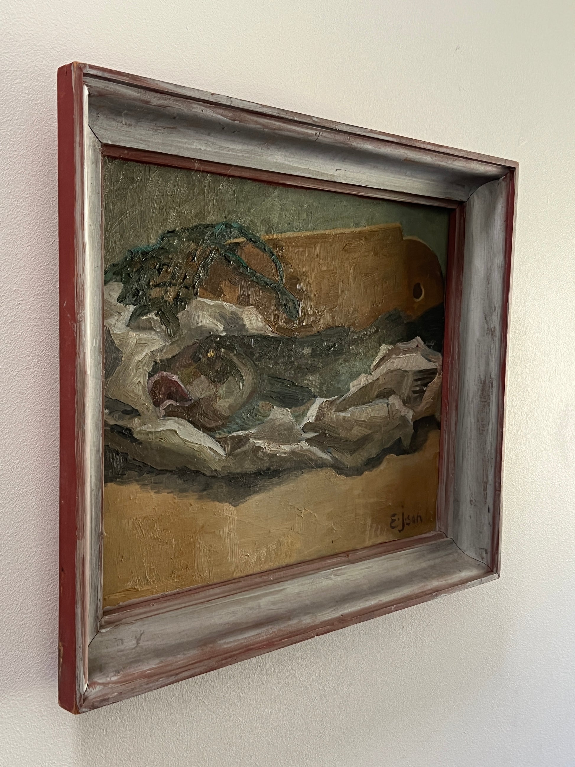 Swedish mid century still life featuring a fish and wooden chopping board. Signed by the artist, E. J-son. Lovely organic muted palette and textural brushwork. This authentic piece would work wonderfully in the kitchen.